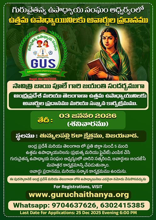 ఉపాధ్యాయుల , విద్యార్థుల సంక్షేమమునకు మరియు విద్యాభివృద్ధికి, తద్వారా సమాజ అభివృద్ధి కొరకు, క్రొత్తగా ఏర్పడిన గురుచైతన్య ఉపాధ్యాయ సంఘమునకు స్వాగతం.